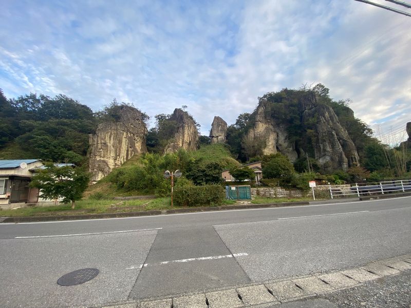 道路のすぐわきにごつごつした、手の付けられていない自然の大谷石の山があります。長年の風化により山がえぐられたような風貌になっています。名前は、兜岩と命名されています。大谷地区は、大谷観音、平和観音、大谷史料館の採掘跡見学コースがお王道なルートがあります。が歩きや、レンタサイクルなどで、ぶらりと奇岩石を見つけては、いかがでしょうか。