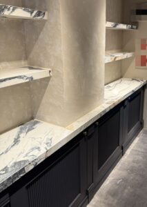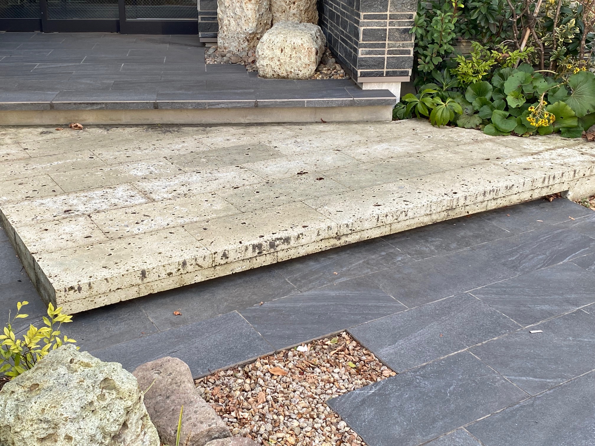 マンションのアプローチがあります。そこには、階段状に、黒い玄昌石のようなタイル。その間に6cmほど厚い、300×600mmの大きさで馬張りでほどこされています。まっすぐにのアプローチでなく、斜めっているそれは、趣があります。