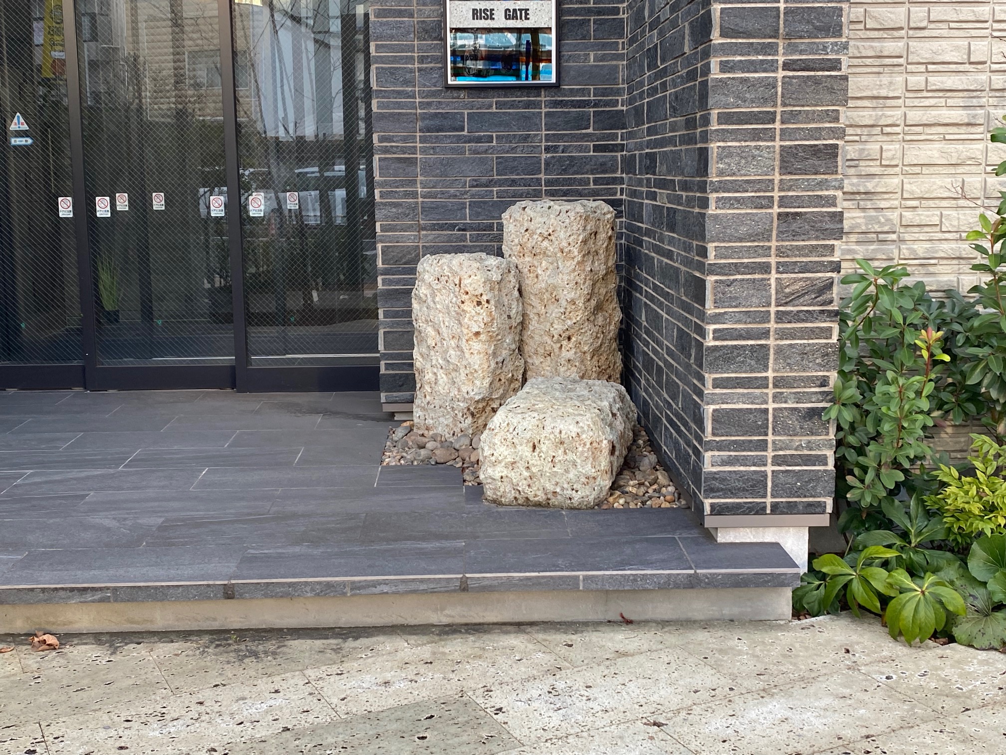 餃子店の近くに、原石の表面を、ぼこぼこに、つついた、縦置きや横置きの大谷石オブジェが、マンションエントランス横に、飾ってあります。何の用途に使われるのかは、わかりませんが、たぶん、芸術的なものかと感じられます。手前には、大谷石床も、