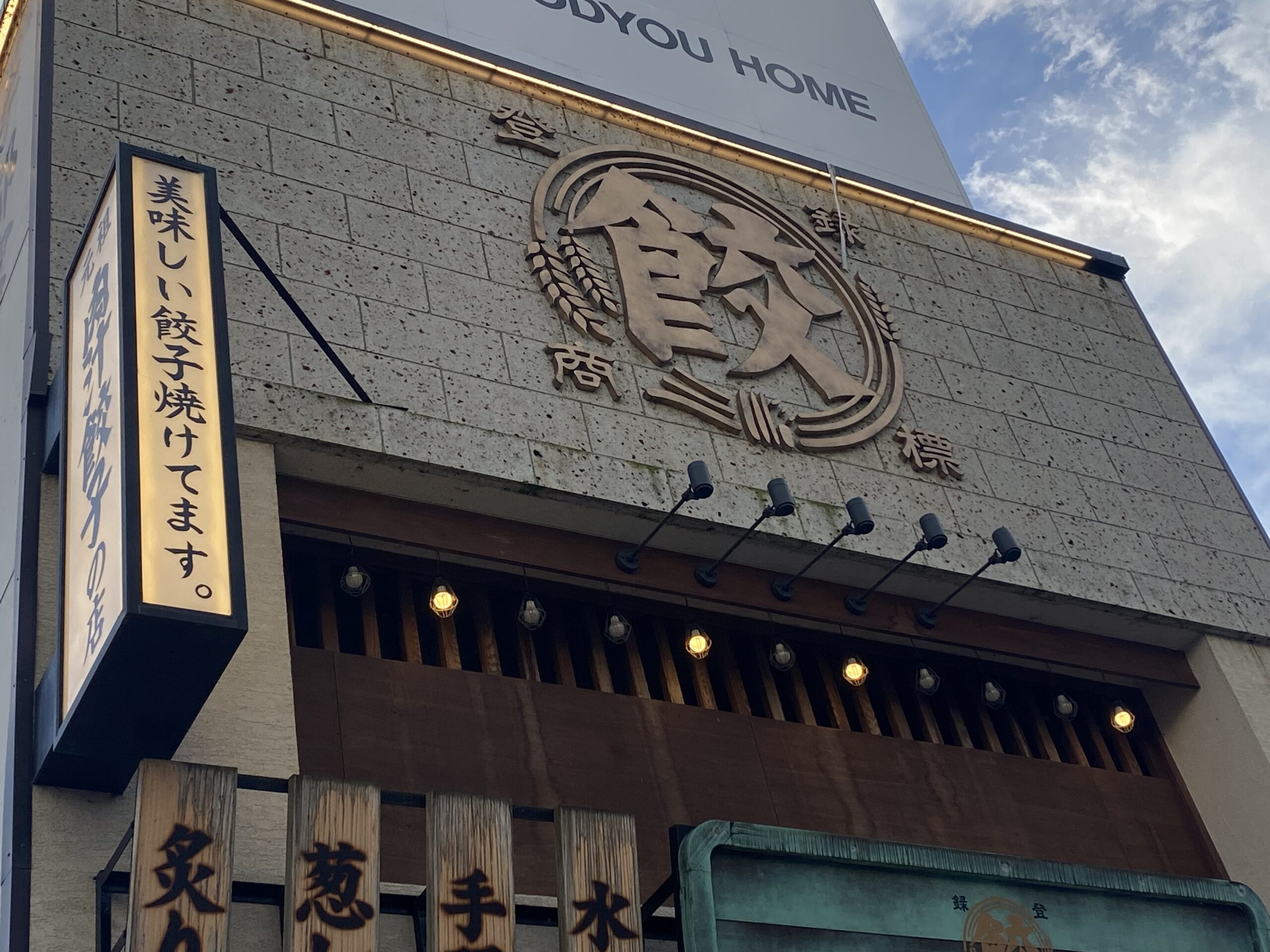 天空には、カラスが家路に向かう中、店が始まる、夕暮れ時に、ダウンライトの明かりがあたる大谷石。その前に、餃子店の金色の屋号がうきたっています。なかなか、上のほうにあるので人は、見上げませんが、渋い大谷石の使い方をしているなと思いました。もうすこしで暗くなり、それも目立ってきます、