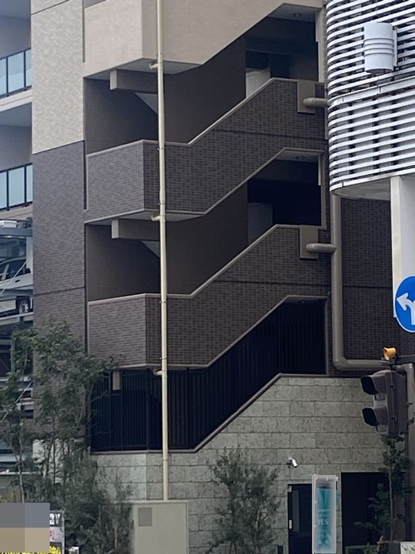 マンション上層階は、茶色とベージュ色のタイルの外壁です。1階から2階に行く階段の外壁に大谷石が使われています。玄関と同じ馬張りの大谷石中目材コーピン仕上げが、使用されています。