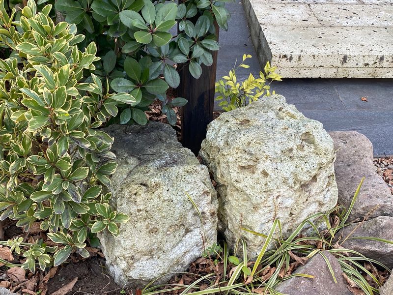 植栽の中に大谷石が2個置かれています。なにげなく置かれているそれは、なんのプレッシャーもなく、心が和む、すーっと素通りできる魔法の大谷石の置物かもしれません。